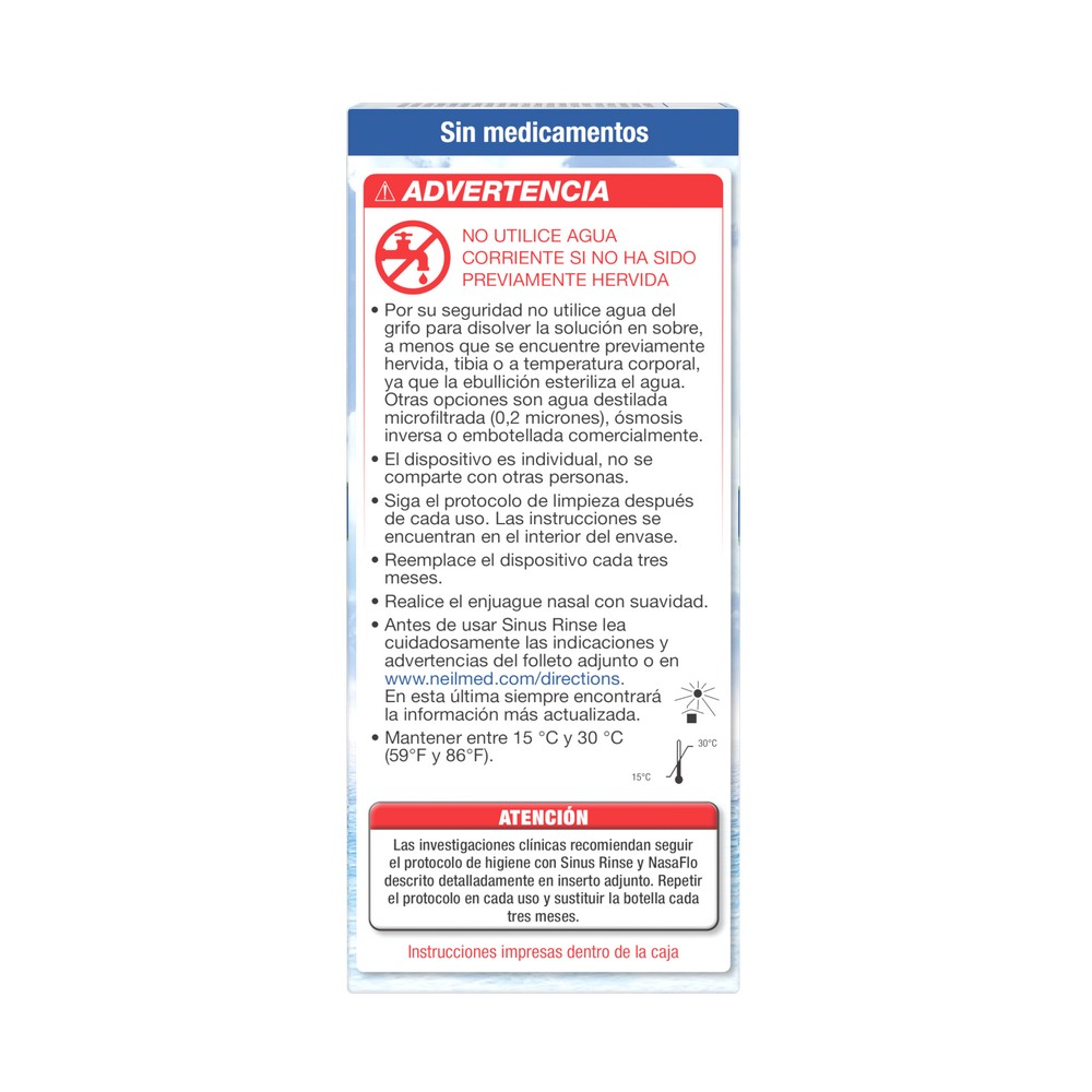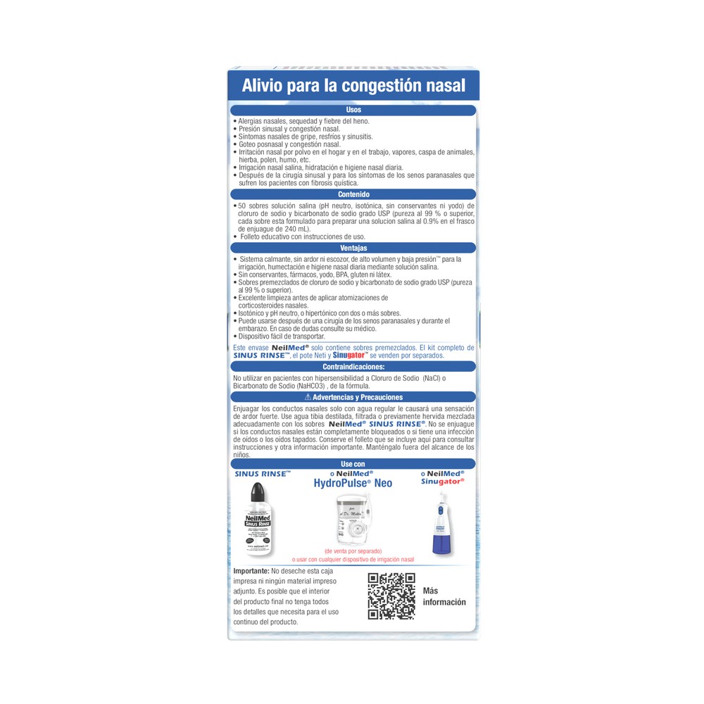 La Recarga viene con 50 sobres premezclados para ser ocupados con kit SinuRinse o cualquier otro dispositivo de irrigación nasal.